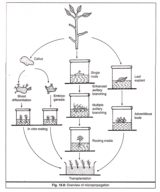 Methods of Micropropagation: Different methods of micro-propagation are Meristem culture, Callus culture, Cell culture, Embryo culture, Protoplast culture, Shoot apex grafting, and Pollen grain culture.